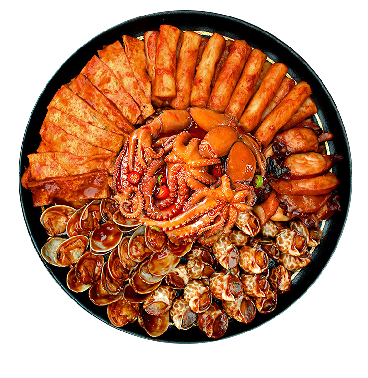 韓式炒年糕(速凍面米食品)、魚(yú)餅(速凍肉糜類(lèi)制品)、韓式甜辣醬(復(fù)合調(diào)味料)、蛤肉、花螺、魷魚(yú)足片、小章魚(yú)、蝦